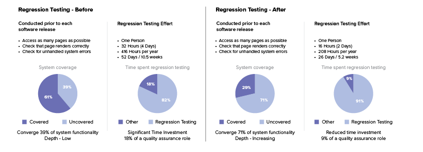 Manual regression effort down from four days to two, freeing up time for personal development and other quality assurance.