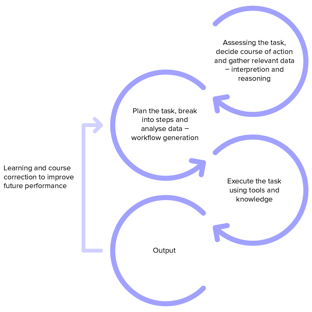 An AI agent can gather data which it then processes and interprets to generate insights, followed by a feedback loop to reassess through learning and thereby redefine future responses (see Figure 1).