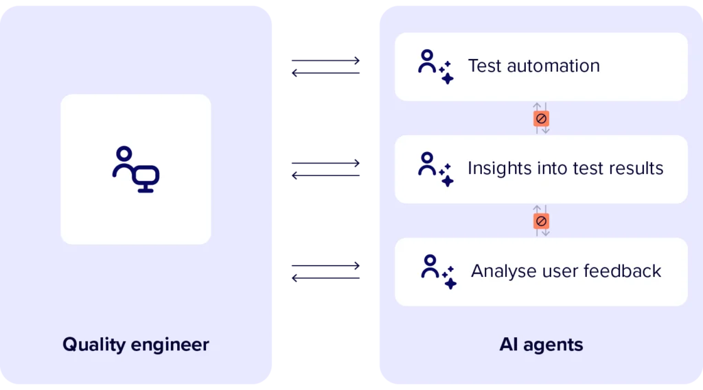 AI agents can be described as digital support staff, provided with a job description that they should perform. AI agents should be viewed as helping to complete tasks better and faster. AI agents will allow quality engineers to focus on higher value tasks, empowering them, and enhancing the work of a human in specific areas or tasks. Meanwhile, the AI agent will take care of other repetitive or mundane tasks, allowing for sequencing of the quality and testing tasks. It is almost inevitable that AI agents will have an impact on people’s jobs, but they are not likely to completely replace humans across quality engineering as that would be incredibly complex and an enormous effort to set up, if even possible.