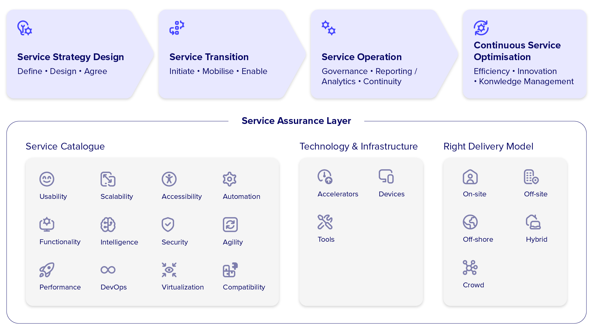 Our proven ‘QuickStart’ approach streamlines the on-boarding process and ensures we deliver value immediately. This includes transition to offshore delivery for efficiency gains with minimal delivery risk.
