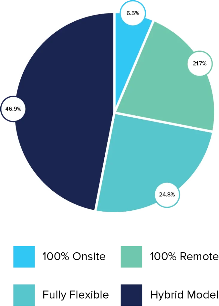 Of the remaining 93.5%, 21.6% stated that they will continue to work remotely full-time. Meanwhile, 46.9% will follow a hybrid model with a percentage in the office at a given time, and 21.7% will benefit from fully flexible working. A global survey by World Economic Forum found that 39% work mostly from home and 22% work outside their homes but not in an office, while the McKinsey Global Institute found that 20 to 25% of the workforce expects to work flexibly from home three to five days a week.